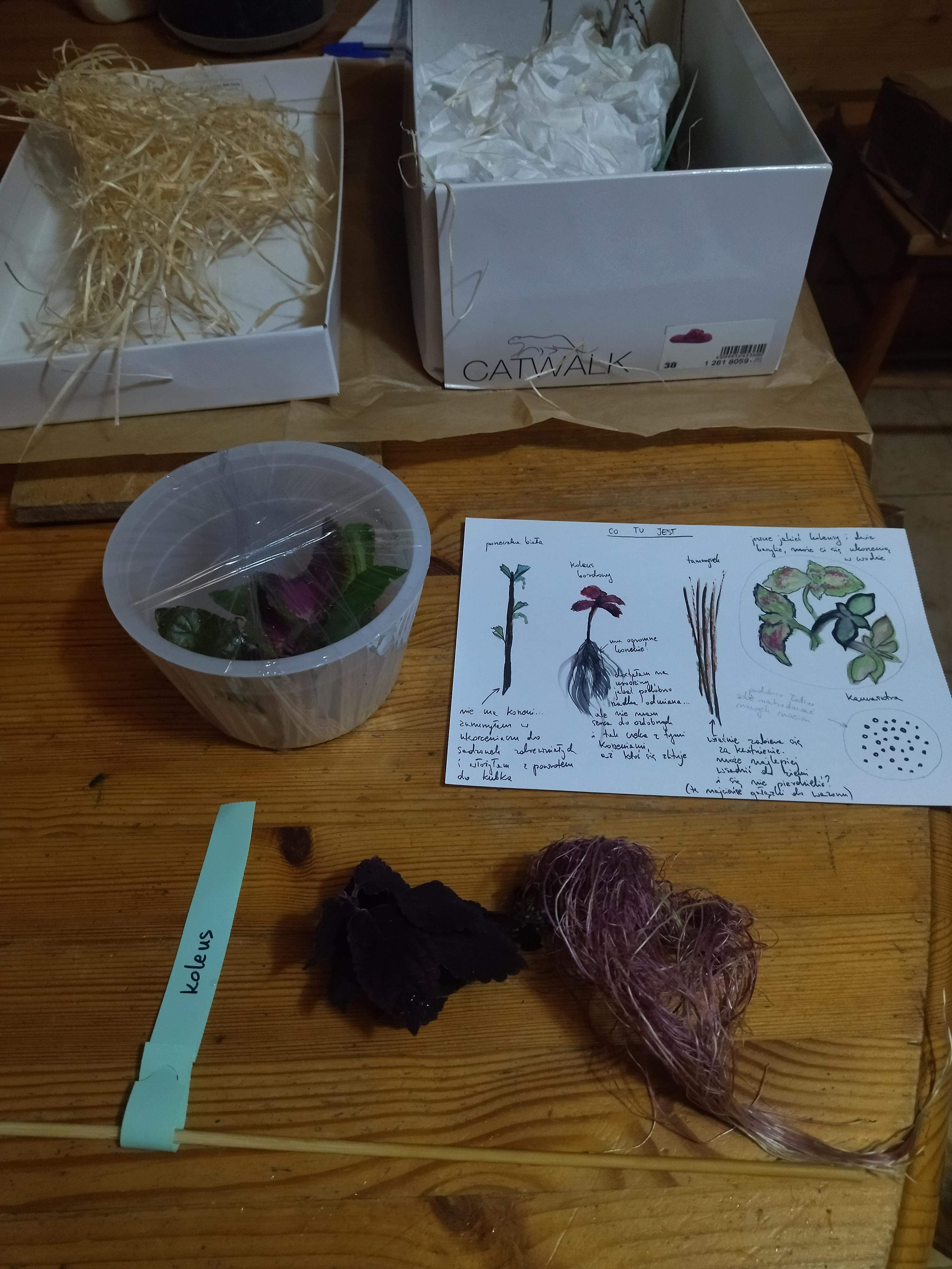 Gdy otwieram przesyłkę, poza gratisami (aa, masz jeszcze pęd bazylii, może się ukorzeni) czeka na mnie plon piękna. W sposobie ułożenia sadzonek w pudełku po butach. W zadbanych etykietkach. Wreszcie w akwarelą malowanej kartce informującej, co my tam mamy i jak o to zadbać.