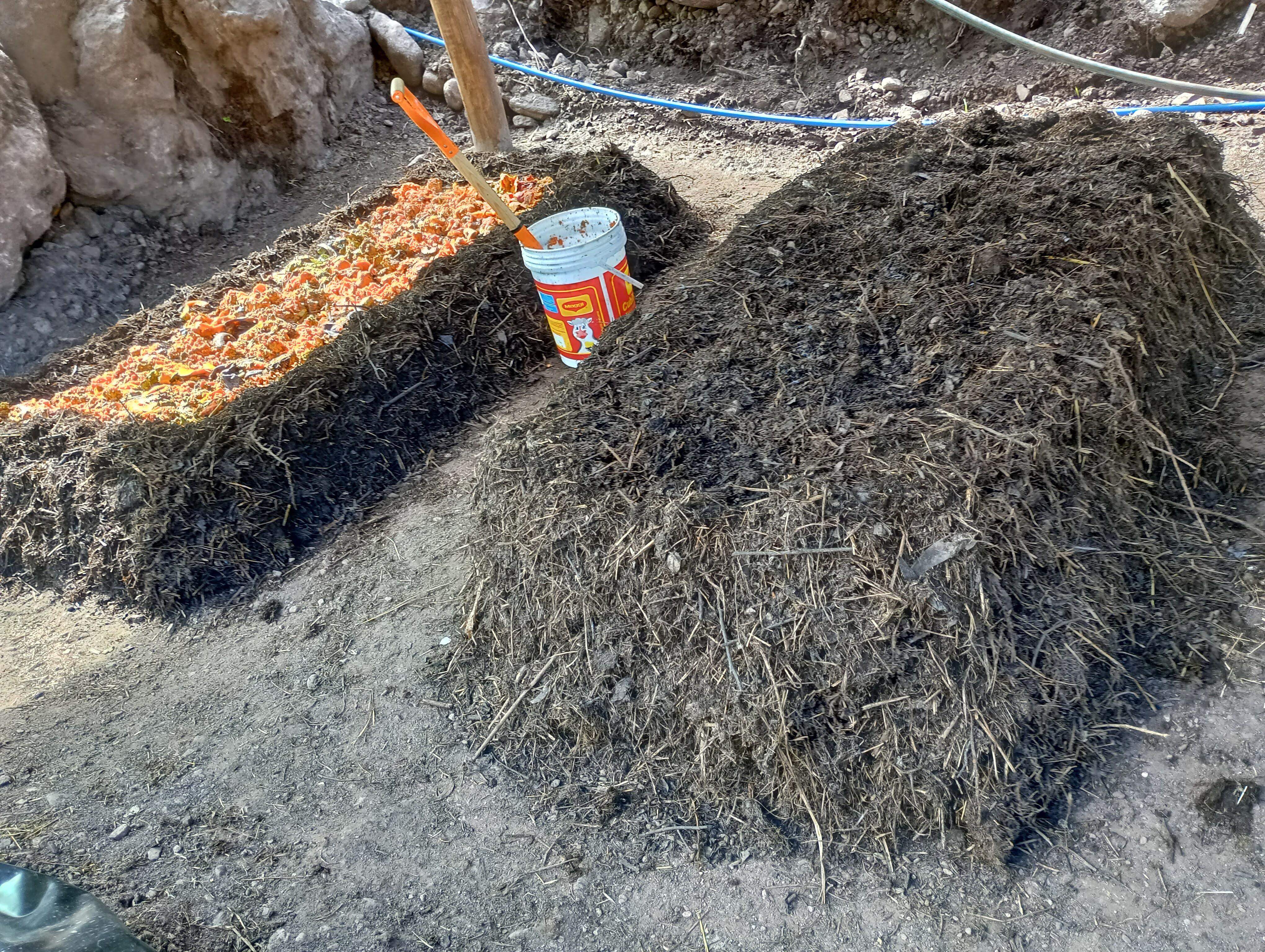 Tak czułego sięgania po każdą niewielką porcję i zsypywania jej gestem, jakim mistrz kuchni posypuje danie parmezanem, nie widziałam u nas ani wśród ogrodników ani wśród niedźwiedzi. Sama też berkeleyowe komposty przerzucałam zawsze dynamicznie, rywalizacyjnie, w starciu choćby i z samą sobą. Tymczasem tu dnie z pryzmą były jednymi z lżejszych. Powolne, pełne namysłu i napowietrzania ruchy nie mogły się równać wysiłkiem z kopaniem gliniastej ziemi ciężkim kilofkiem czy z noszeniem kamieni. Na zdjęciach widać jak przesypuję pryzmę wytłokami z soków*, które zazwyczaj trafiają do wermikompostownika, tym razem jednak Gualberto uznał, że dżdżownice jeszcze nie są głodne.
